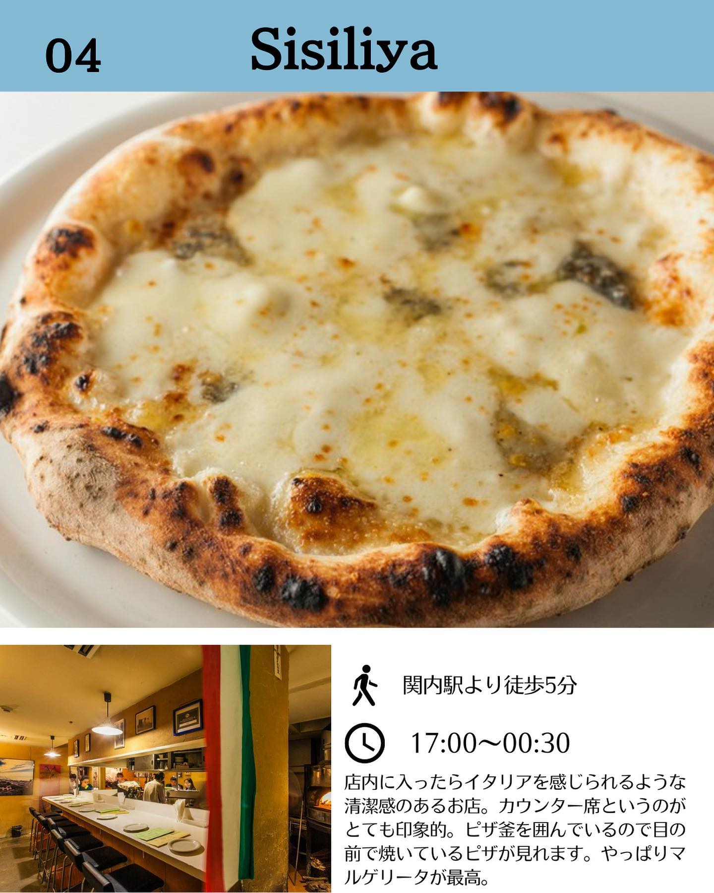 関内の老舗ナポリピッツァ店シシリヤは、機械を使わず手で練った生地を前日仕込み、薪窯で香ばしく焼き上げます。マエストロ称号を得た職人技と、カウンターで出来立てを味わえる贅沢が魅力。現金のみ、予約必須、17:00~23:00。
