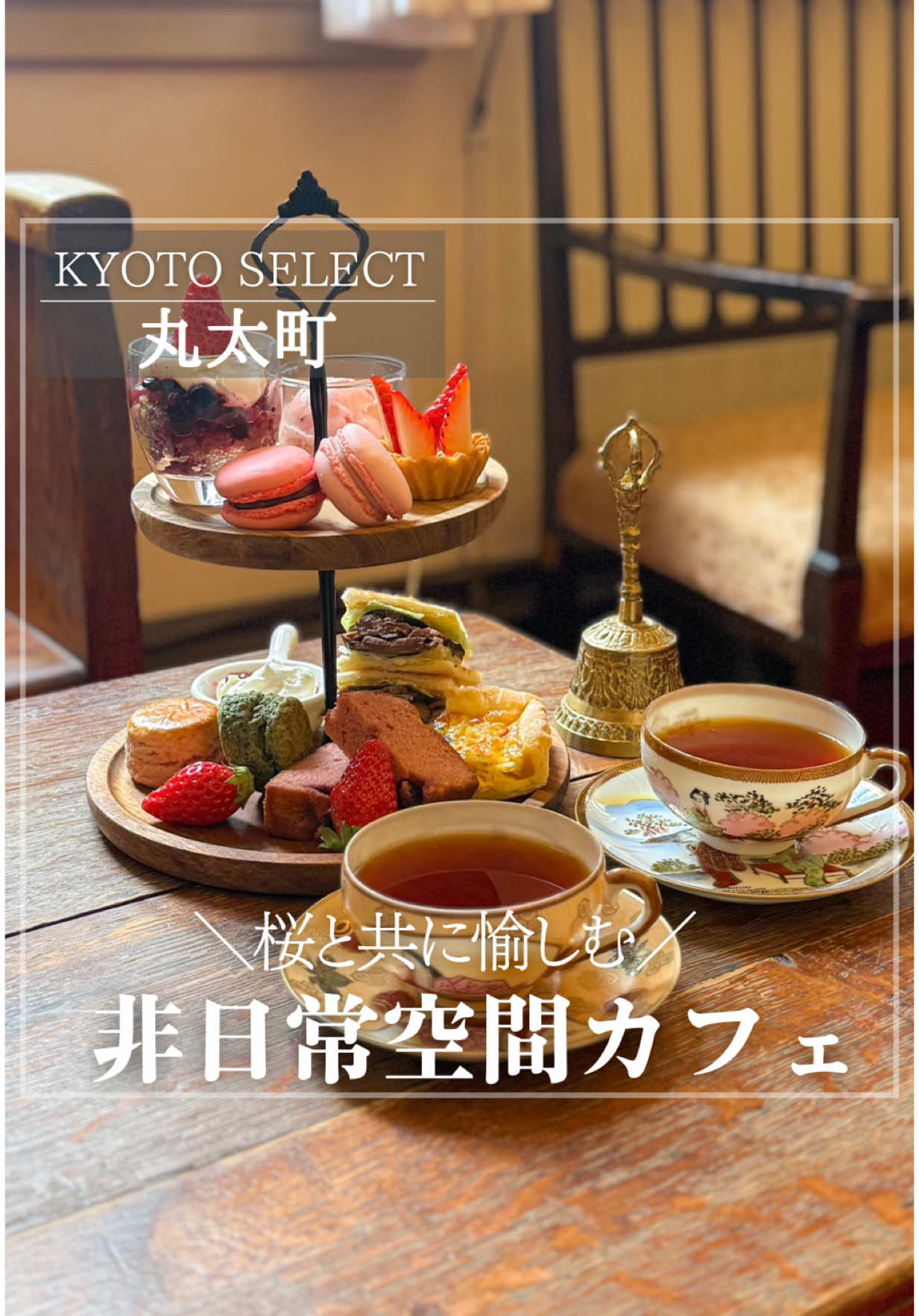 京都府庁旧本館1階にある大正ロマンのクラシックカフェです。中庭の桜を望む眺めと高い天井・自然光の明るい空間が魅力。朝8時開店でモーニングは1904 SPモーニングセットやクロックムッシュ。アフタヌーンティーは苺ベリーのミニパフェやスコーン、紅茶はセイロンまたは弁慶でおかわり無料。