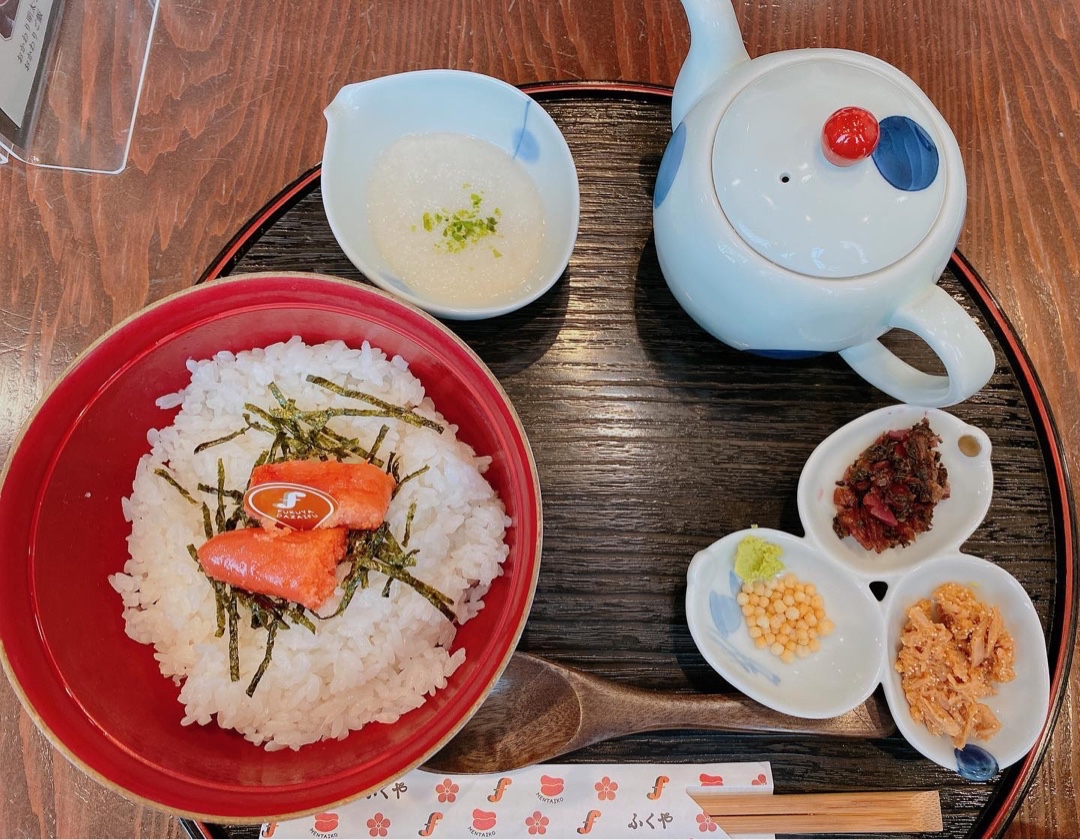 大宰府天満宮の参道にあるふくや たらふく茶屋では、明太子を使った茶漬けセットが名物です。ご飯のおかわりが自由で、明太子の美味しさを活かす3通りの食べ方を楽しめます。福岡を代表する明太子の味を、気軽に味わえるお店です。