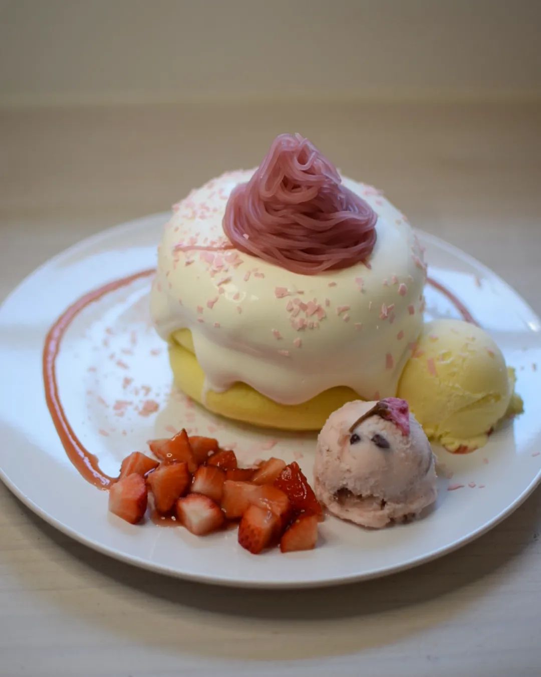 パンケーキ専門店 バター&ミルクは、ふわふわ生地とメレンゲを合わせた食感が特徴の店です。季節限定のメロンやさくらなど、北海道純正クリームやさくら餡・さくらアイスを組み合わせたパンケーキを提供します。窓際席の演出も写真映えで人気です。