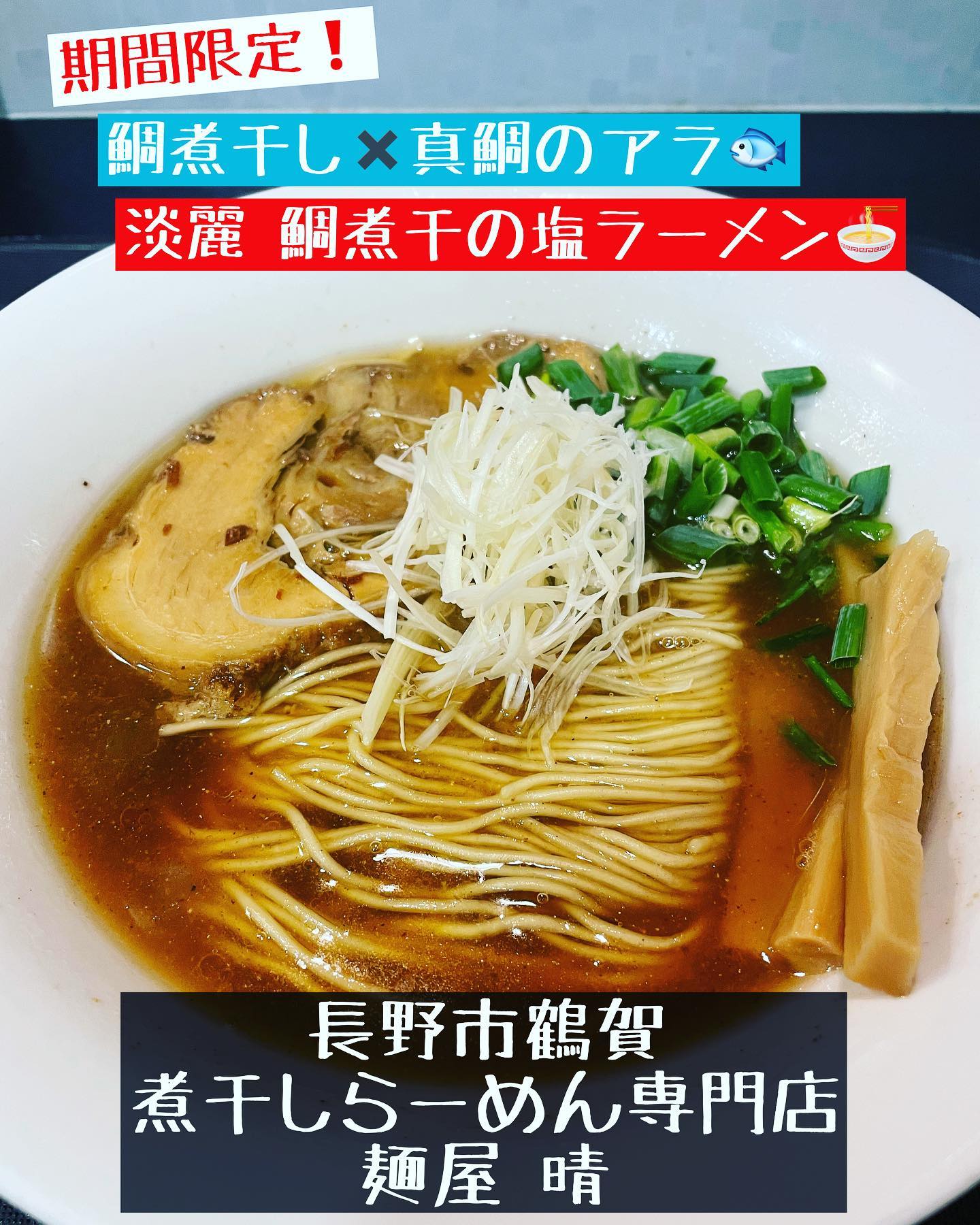 長野市の行きつけ❗️煮干し専門店『麺屋 晴』の限定ラーメン🍜今回はなんと鯛❗️がテーマという事で「淡麗 鯛煮干(醤油)」(980円)。