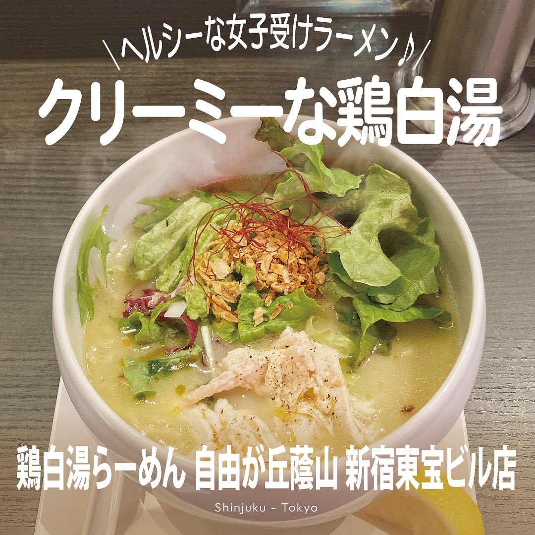 新宿東宝ビル1Fの『自由が丘蔭山』は、蔭山樓が手がける鶏白湯ラーメン店。8時間煮出しの鶏白湯スープが特長で、鶏白湯塩そばはクリーミーでヘルシー、特製担々麺は辛さ控えめかつヘーゼルナッツ風味。価格は880〜980円でコスパも良く、カウンター中心の清潔な空間で女性にもおすすめです。