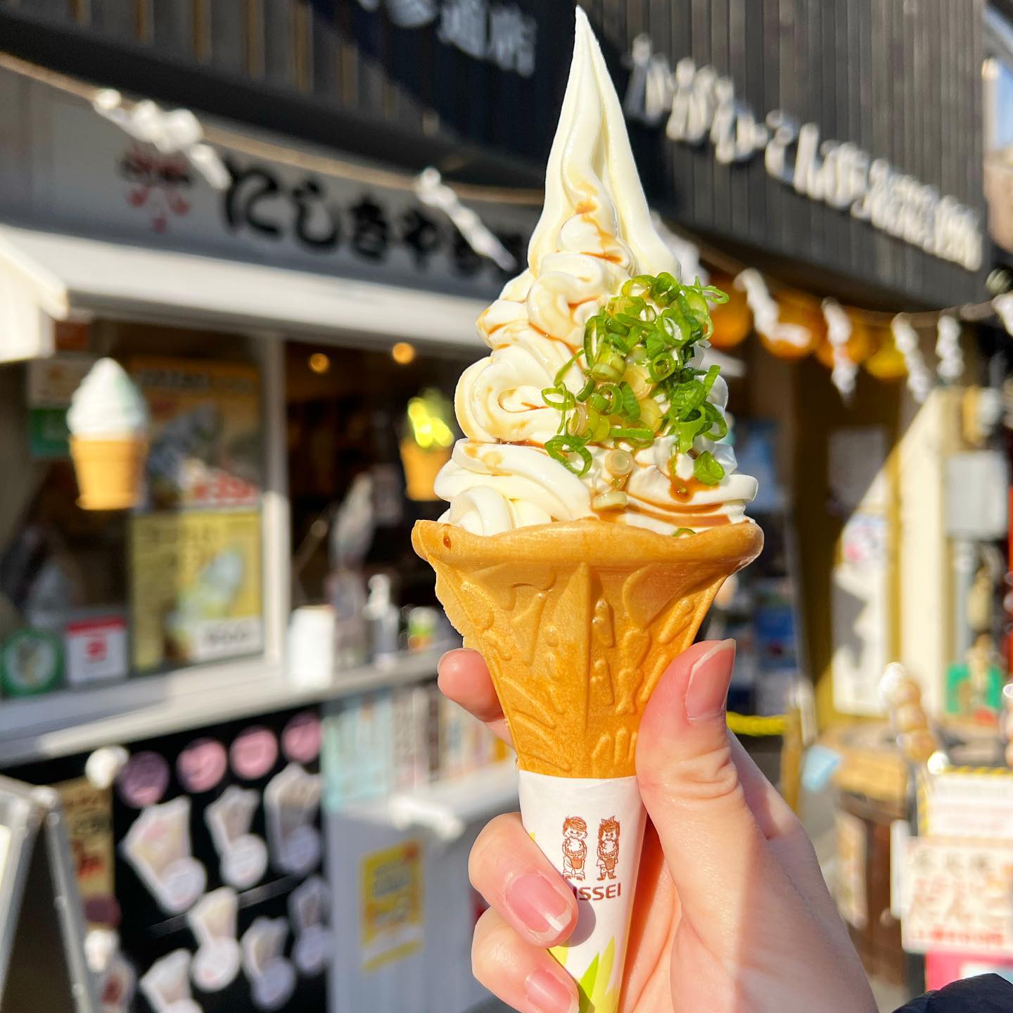 香川県・琴平の金比羅山参道にある『しょうゆ豆本舗』の名物は、見た目がうどんそのものの『かまたまソフト』です。生姜風味のアイスにネギとしょうゆをかけ、うどん感覚の新感覚スイーツを楽しめます。