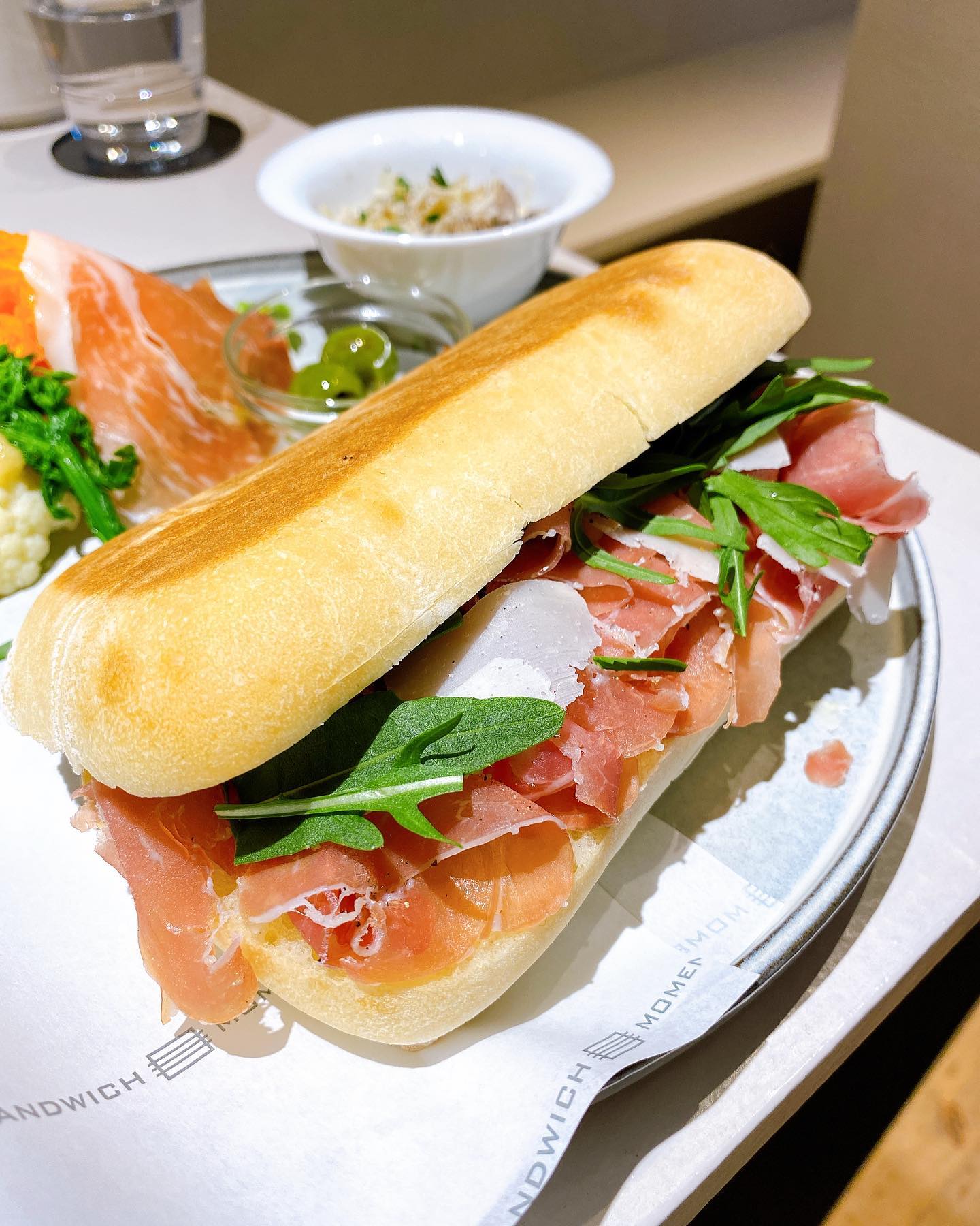 国産長期熟成生ハムを専門に扱うサンドイッチ店・サンドイッチモーメントです。生ハムの食べ比べを楽しめ、コラボメニューとしてクレープ×生モッツァレラチーズとピスタチオソース、坊ちゃんかぼちゃポタージュなどが登場します。