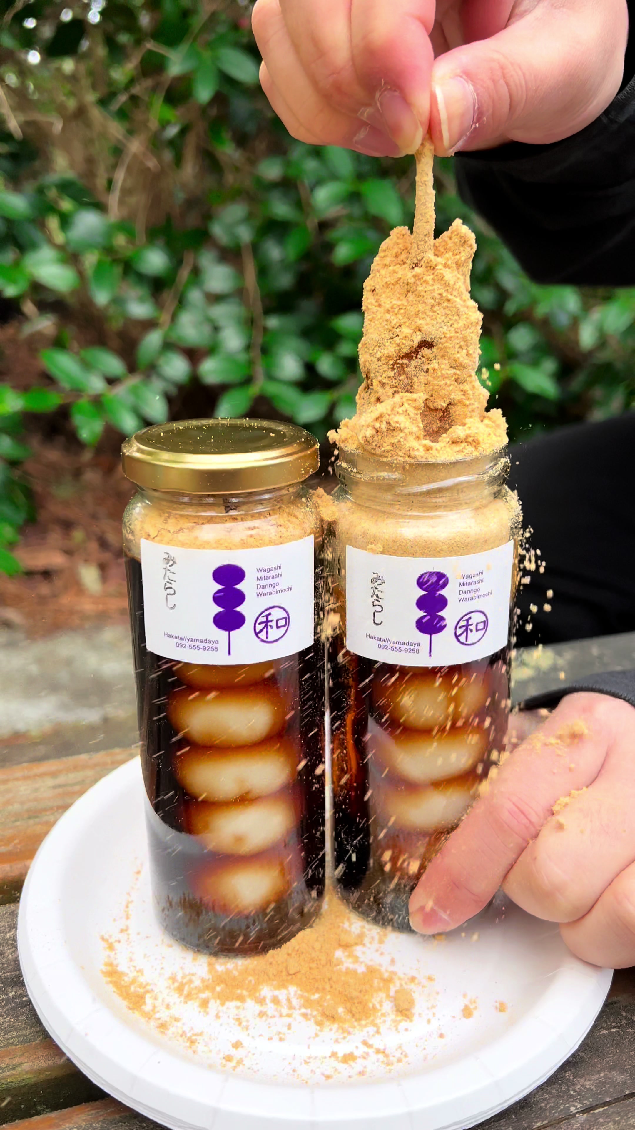 《きな粉が溢れるみたらし団子(Mitarashi dango with soybean flour spilling out of the jar)》