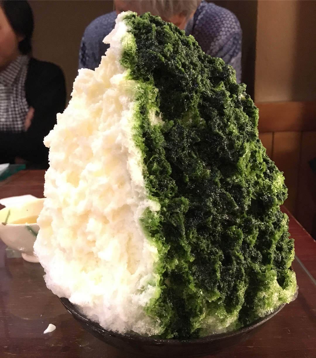 都立大学の老舗和菓子店『ちもと』の夏の名物、抹茶とミルクの2色かき氷です。食べ進めると底から小豆・栗・白玉・寒天がゴロゴロと現れ、ボリューム満点。『おまかせ』で味わえば1100円とコスパも抜群です。