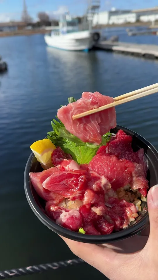 とれとれ市内の雅鮮魚店は日曜限定で生本マグロの希少部位を使う脳天・ほほ肉づくし丼が名物の海鮮丼・刺身店です。未冷凍の本マグロの濃厚な旨味を堪能でき、湊駅から徒歩10分・駐車場完備。
