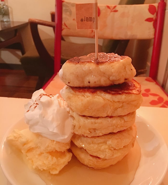 池袋・西池袋のカフェlampは、分厚くモチモチとした自家製ホットケーキを三〜四段で提供する隠れ家風のお店です。基本500円、アイスとクリームを追加で計900円程度。オーナーの温かい人柄と居心地のよい空間が魅力です。