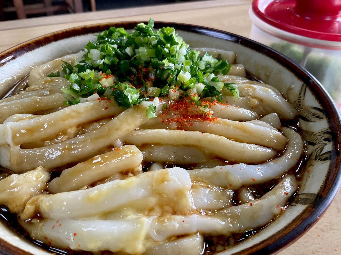 長い歴史を誇る麺類食堂 河崎屋です。伊勢うどんを使うカレーうどんは、トロミ控えめながら太麺にしっかり絡み、肉のボリュームと無料の刻みネギが魅力です。中華そばも名物で、夏は冷やし中華・ひやむぎ・かき氷も提供します。