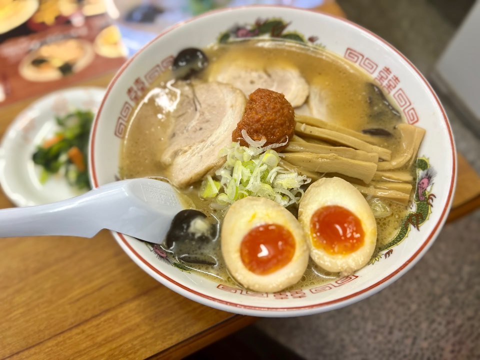 山形県小国町の山奥にある人気店。札幌西山製麺直送のもちもち中太麺と鰹×鶏のWスープにオリジナル辛味噌が相性抜群。味玉と柔らかいチャーシューが絶品。店内はほぼ満席で、冬は雪が3m積もるという雪国の名店です。