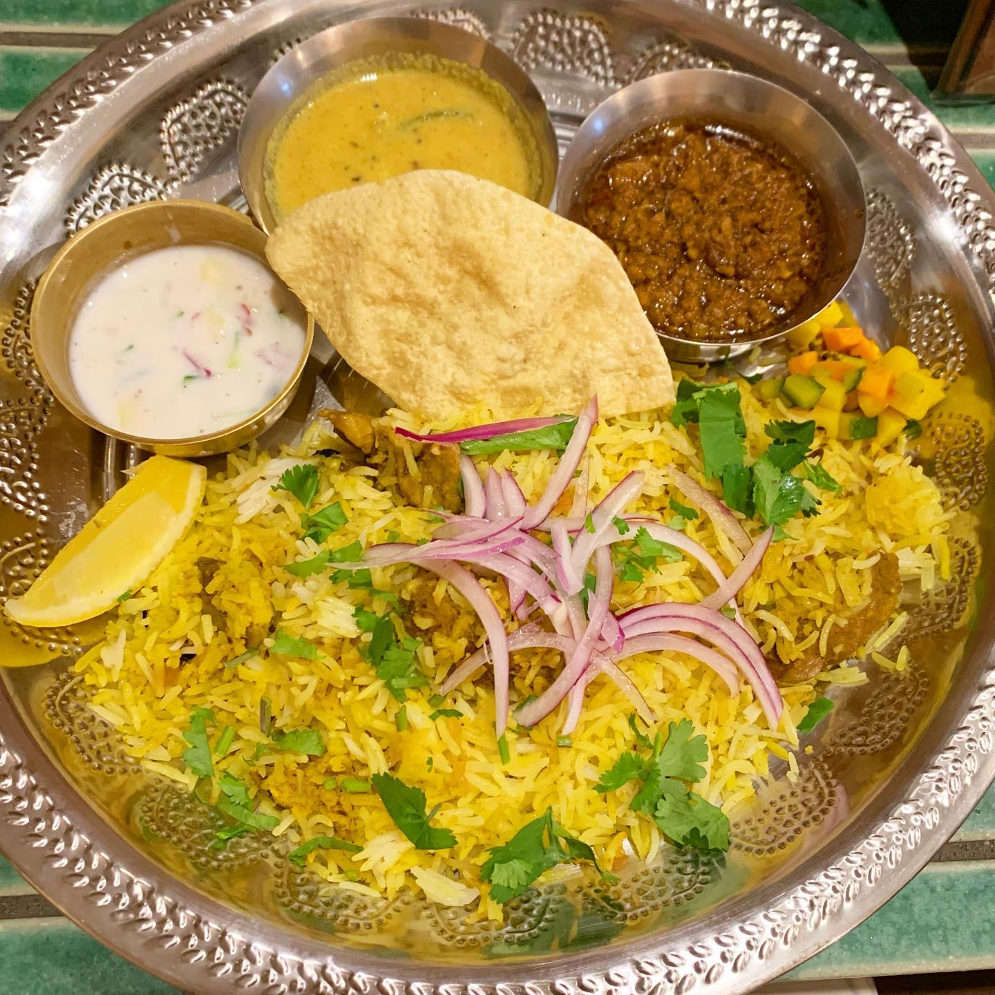 大阪・天満橋のニタカリバンチャは、週替わりのビリヤニ週間が楽しめるお店です。柔らかいラムがたっぷりで辛さはぴりっと。ライタとパパド、キーマトッピングで味の変化を楽しめ、ボリューム満点です。