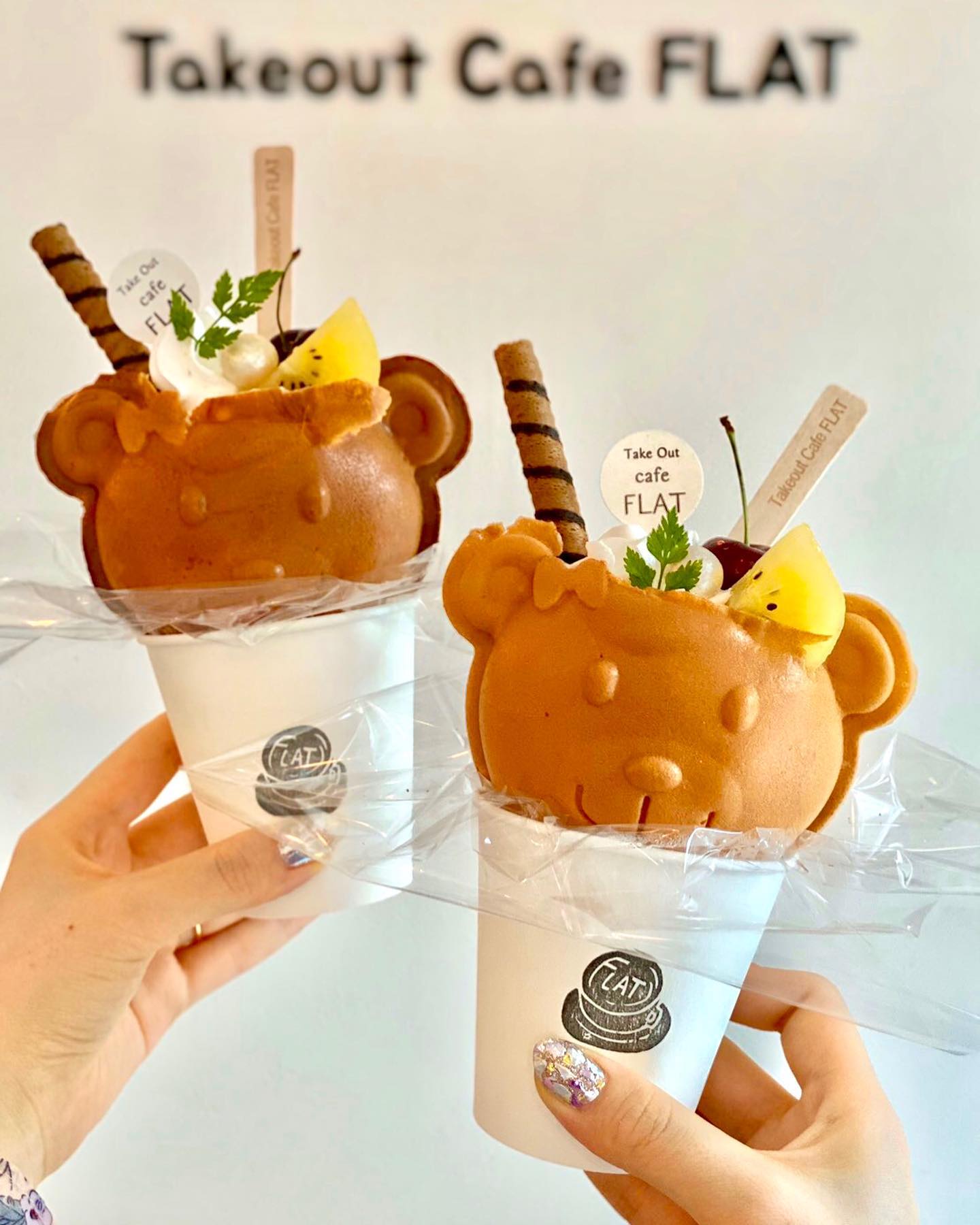 石川・小松市のTakeout Cafe FLATは、韓国風のおしゃれカフェ。くまさんワッフルはサクふわで、クリームはカスタードかクリームチーズを選択、季節のフルーツ付き。イートイン可、木目調のシンプルな店内と透明ボトルドリンクがインスタ映え。