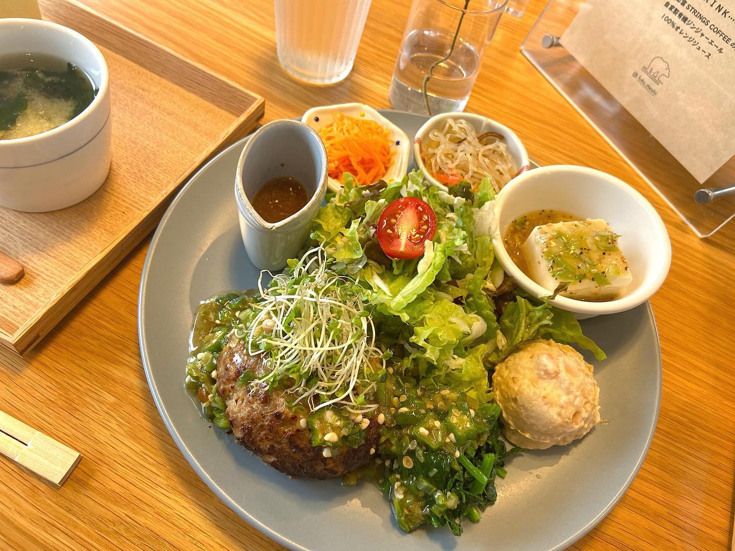 境港のカフェめしくうところふくの週替わりランチふく定食は、ハンバーグを中心に野菜がたっぷり。健康的で味わい深く、日々の食卓にもぴったりな一皿です。