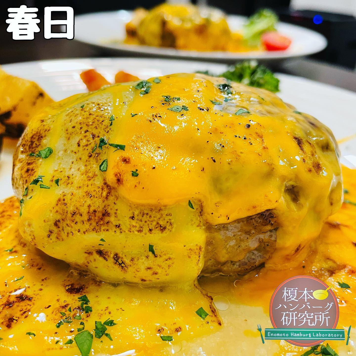 榎本ハンバーグ研究所 春日後楽園店は365種類のハンバーグを研究する専門店。看板の3種の焦がしチーズハンバーグ200gは、アボカドと本わさびクリームにレッドチェダーチーズが絡み、肉汁を閉じ込める生地が特徴です。