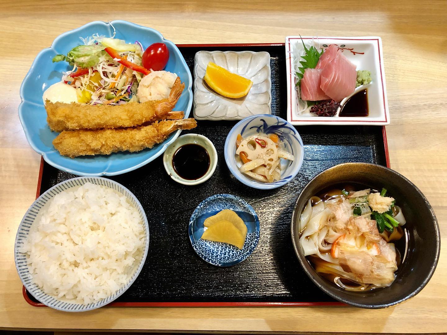 新栄の日本食店です。伝統的な美味しさを活かした定食が人気で、きしめん定食が中心メニューとなっています。海老フライ3尾と麺類付きのランチは950円、マグロ刺身を追加して1300円です。ボリュームと新鮮素材が魅力です。