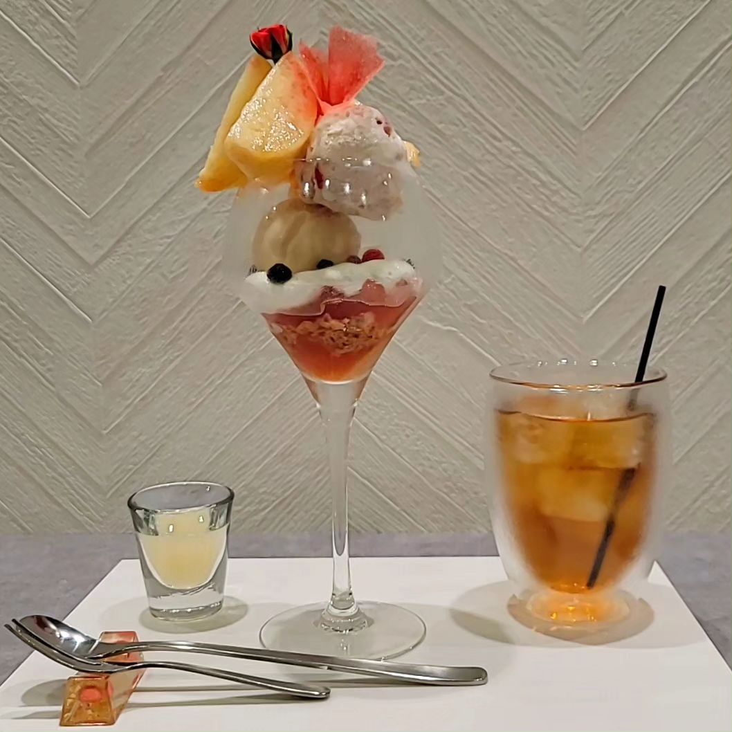 大森駅近くの小さなパフェ専門店and Parfait。白を基調とした店内は約10席です。三種の苺とヨーグルト風ソルベ、苺ソルベ、赤ワインジュレの層が深みを生み、クランブルと苺の濃厚さを最後まで楽しめます。桃パフェも人気です。
