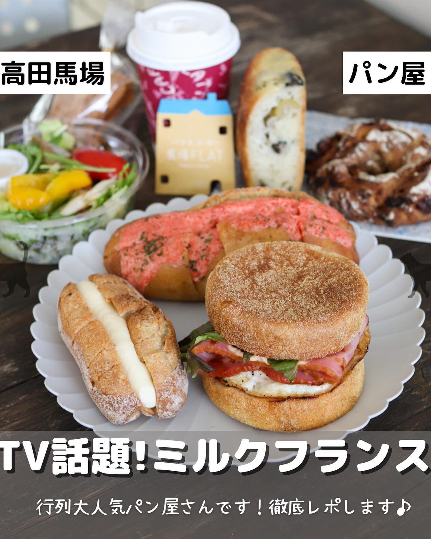 パンとコーヒー 馬場FLATは高田馬場駅近くのベーカリーカフェです。国産小麦100%のパンを中心に、常時50〜60種の豊富なラインナップをそろえています。特に明太フランスはパンの端から端まで明太子ソースがぎっしり入り、薄切りバターを挟むとさらに美味しくなります。イートイン席とテラス席があり、8:30〜19:00まで営業しています。