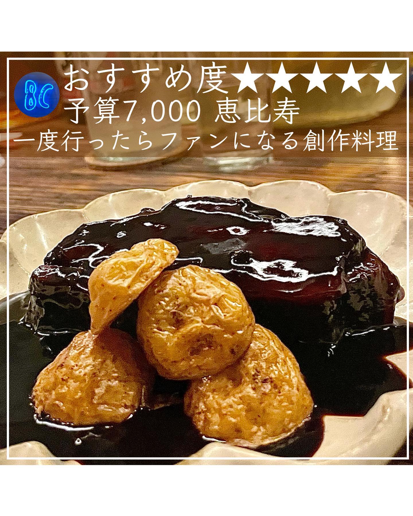 恵比寿の隠れ家風居酒屋。中華とイタリアン要素の創作料理が魅力。鹿肉のロースト・蛸の黒煮・水餃子など多彩。ウニとアボカドのグラタンやラムの麹漬け焼きも看板。自然派ワインと一緒に楽しむ大人の空間。