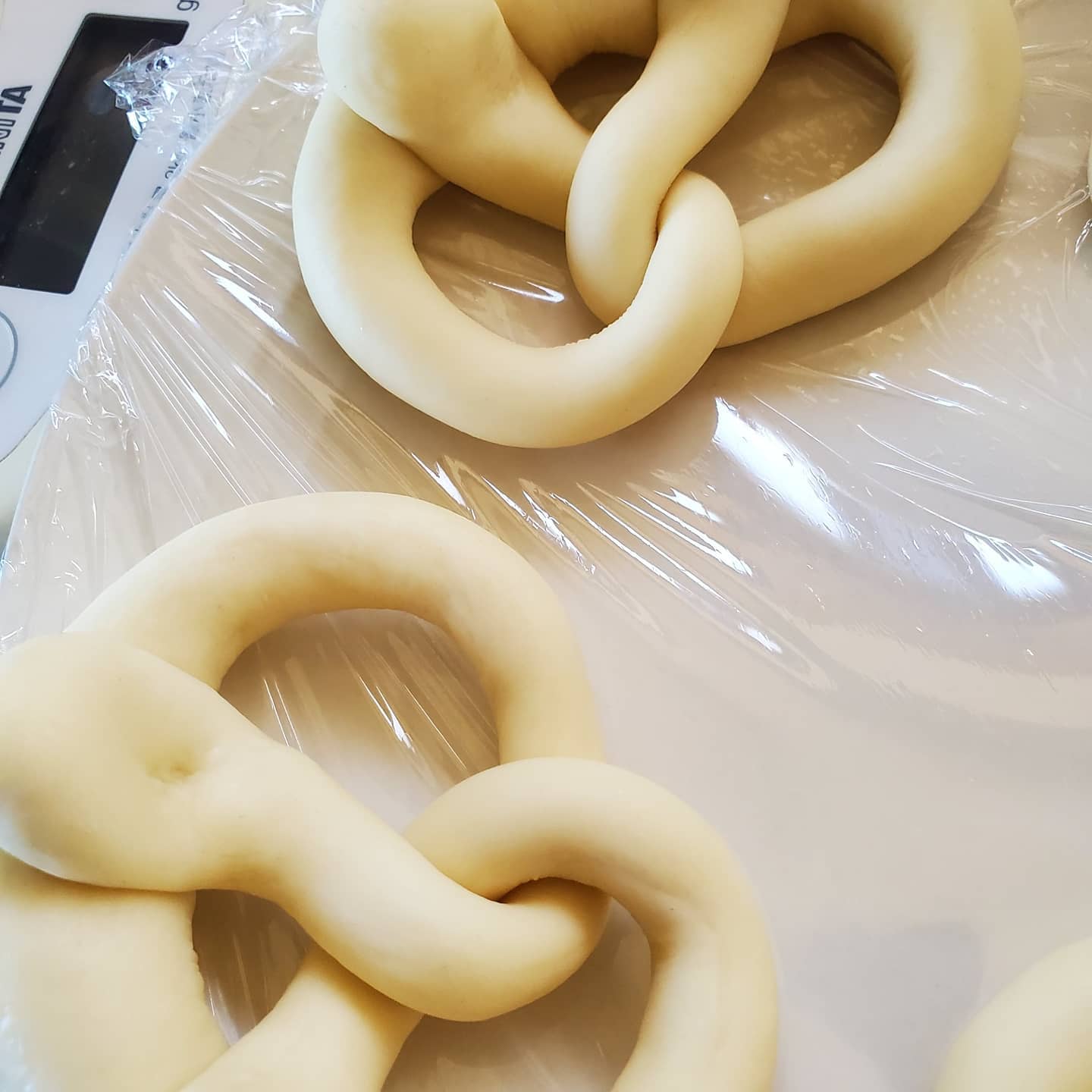 プレッツェルを焼きました🥨尚ちゃん、コネコネ頑張りました(笑)岩塩が恐ろしくしょっぱくて慌てましたが😂💦美味しく焼けました🙆もっと大きく成形したかったけど、お試しだし良いとする👍