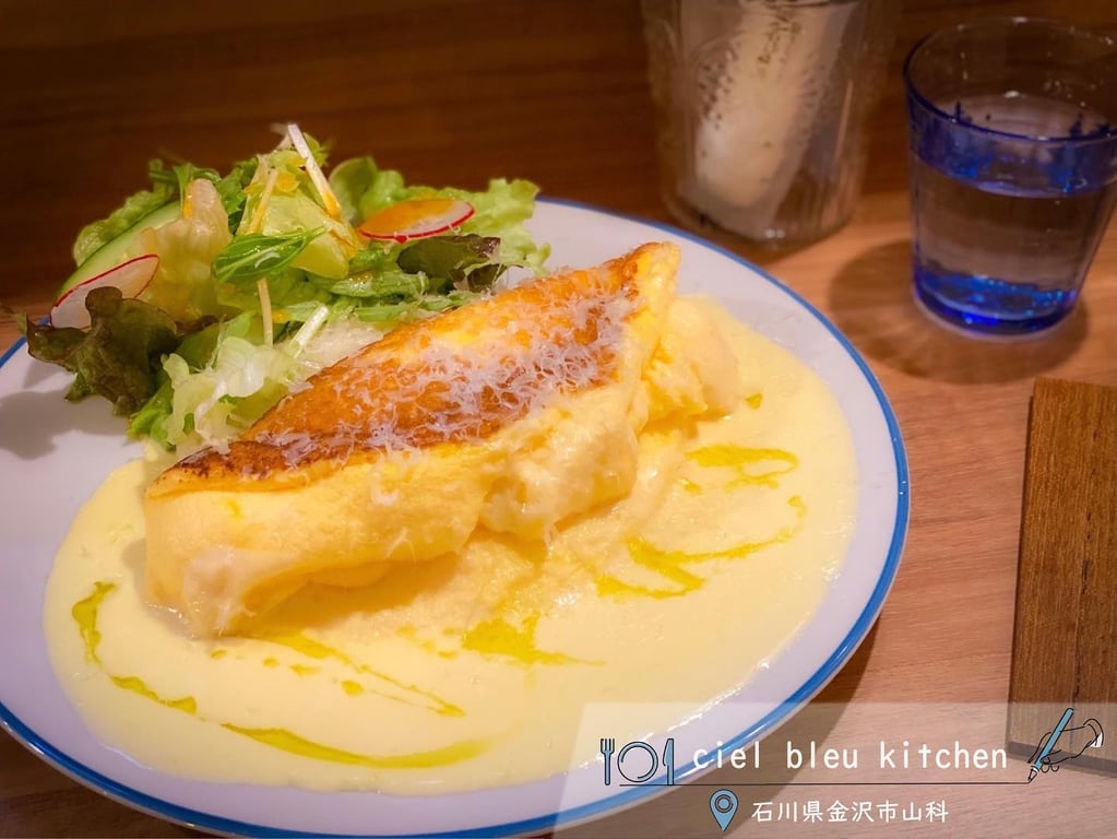 金沢市山科のカジュアルフレンチ、シエルブルーキッチンは庭を望むガーデンテラスと開放的な店内が魅力です。週替わりランチや半熟卵のオムライス、キッシュ、鶏の香草パン粉焼きなどボリューム満点の料理を、庭を眺めながら楽しめます。