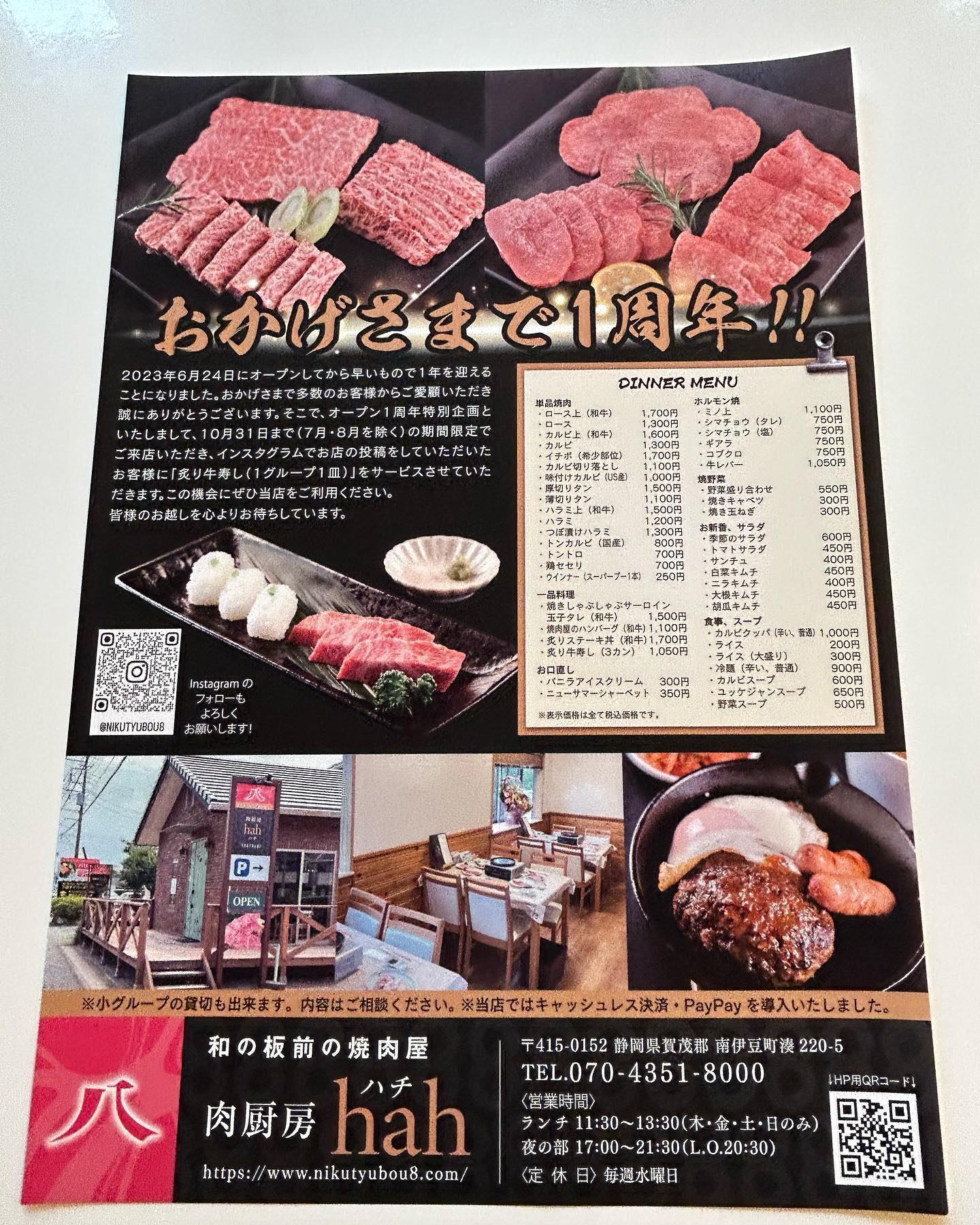 南伊豆の道路沿い136号線にある肉厨房hahは、1周年を機にサービスとメニューをリニューアルしました。ランチ・夜の部とも営業しています。ボリューム満点の肉料理と一本ハラミが人気です。駐車場があります。