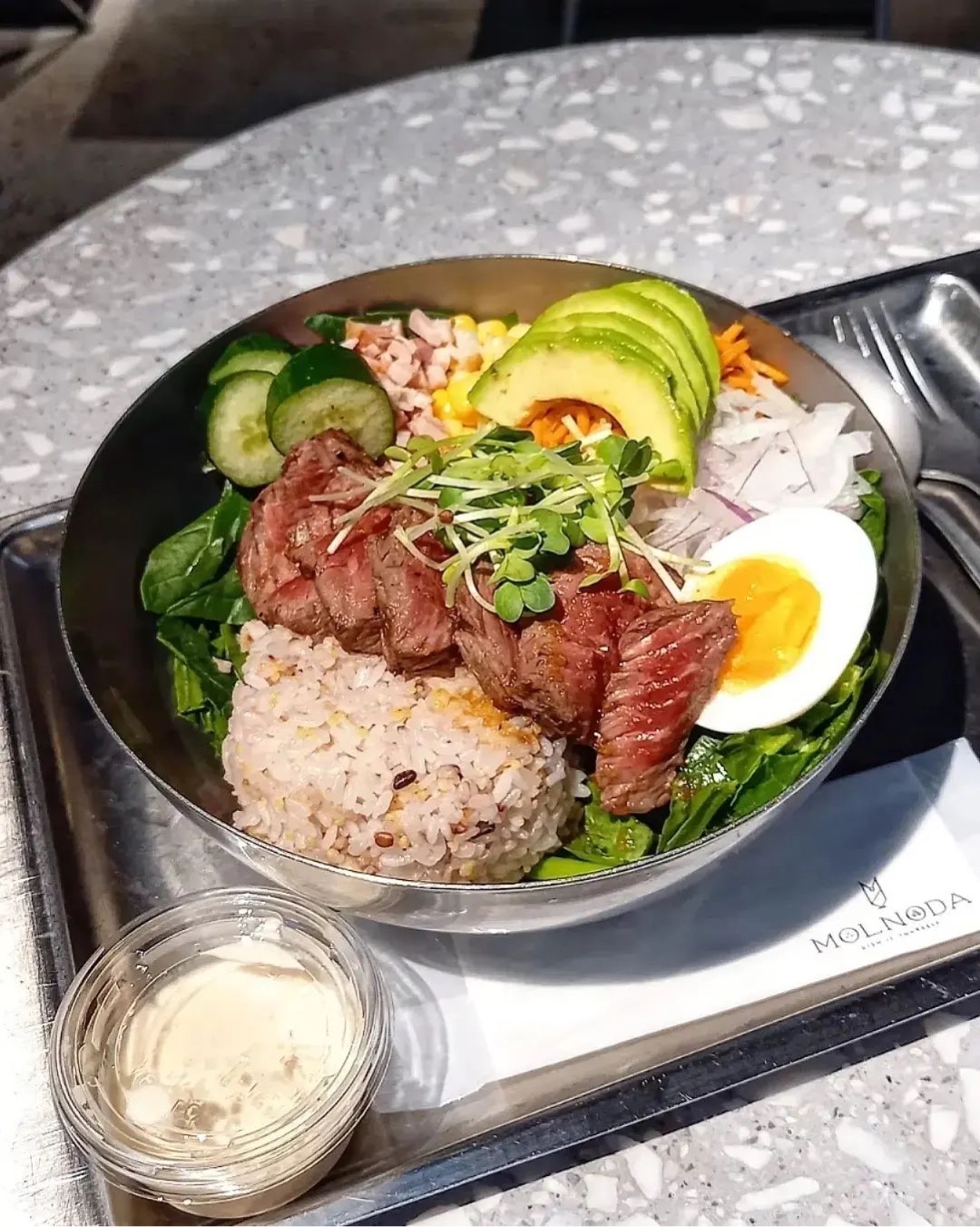 MOLNODAは名古屋・栄の野菜中心ヘルシーボウル店です。100通り以上の組み合わせから自分流にカスタマイズできます。牛もも肉・アボカド・ブロッコリーなど具だくさんです。レモンソルトなど多彩なドレッシングも特徴です。券売機と厨房横動線で注文し、モニター表示で受け取ります。
