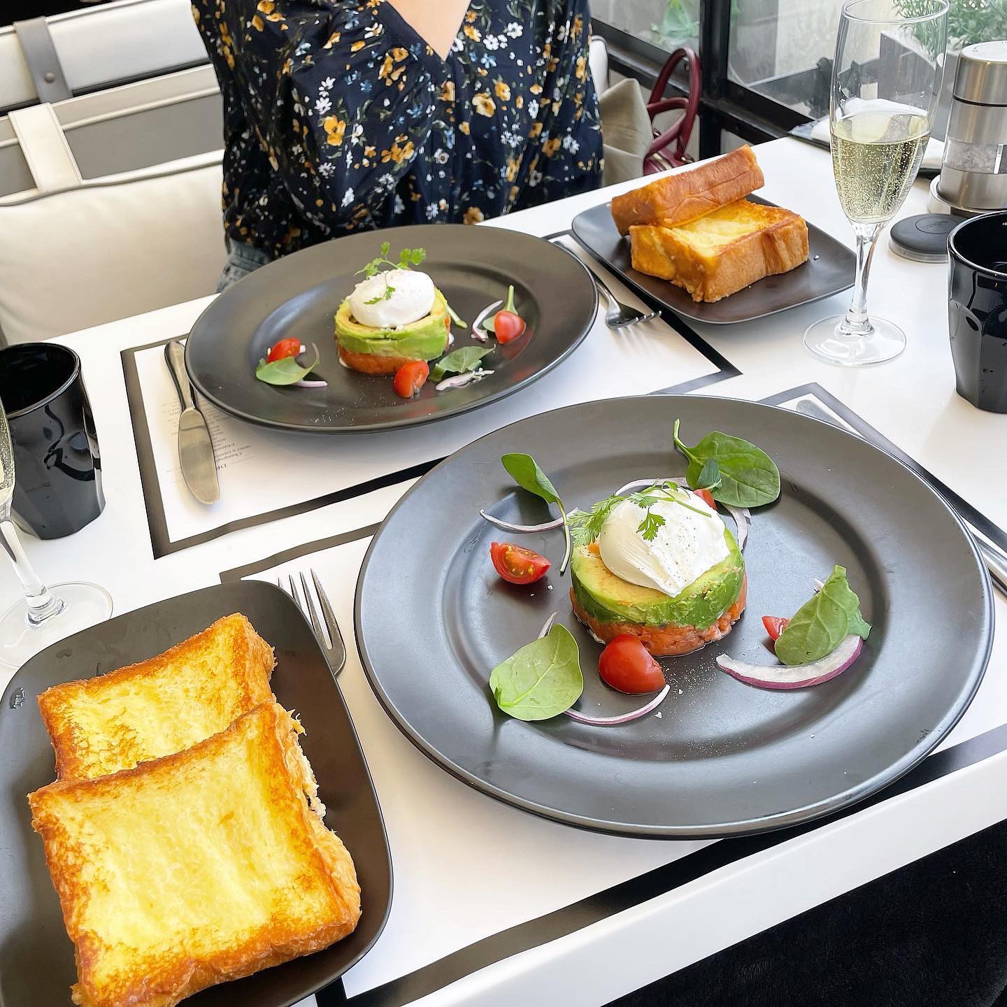 一面ガラス張りのデザイナーズビル最上階で、ホテル級のブランチを楽しめます。看板はブリオッシュフレンチトースト ブランチ(2枚付き)で、9種のメインを選べます。サーモンのタルタルとアボカド、ポーチドエッグなど、セイボリーとスイーツのバランスが絶妙。表参道・青山の4F・5F。