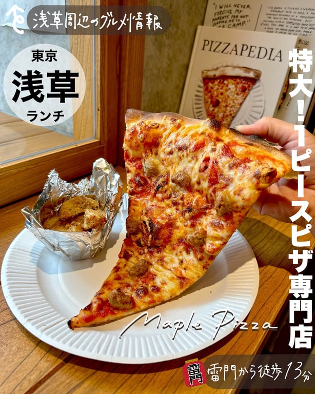 Maple Pizza《田原町》は、アメリカンサイズの特大ピザを1スライスずつ販売するNYスタイルのピザ店です。ピンクの外観が目を引き、田原町駅から徒歩2分・テラス席有り。1人でも入りやすく、テイクアウトも可能です。