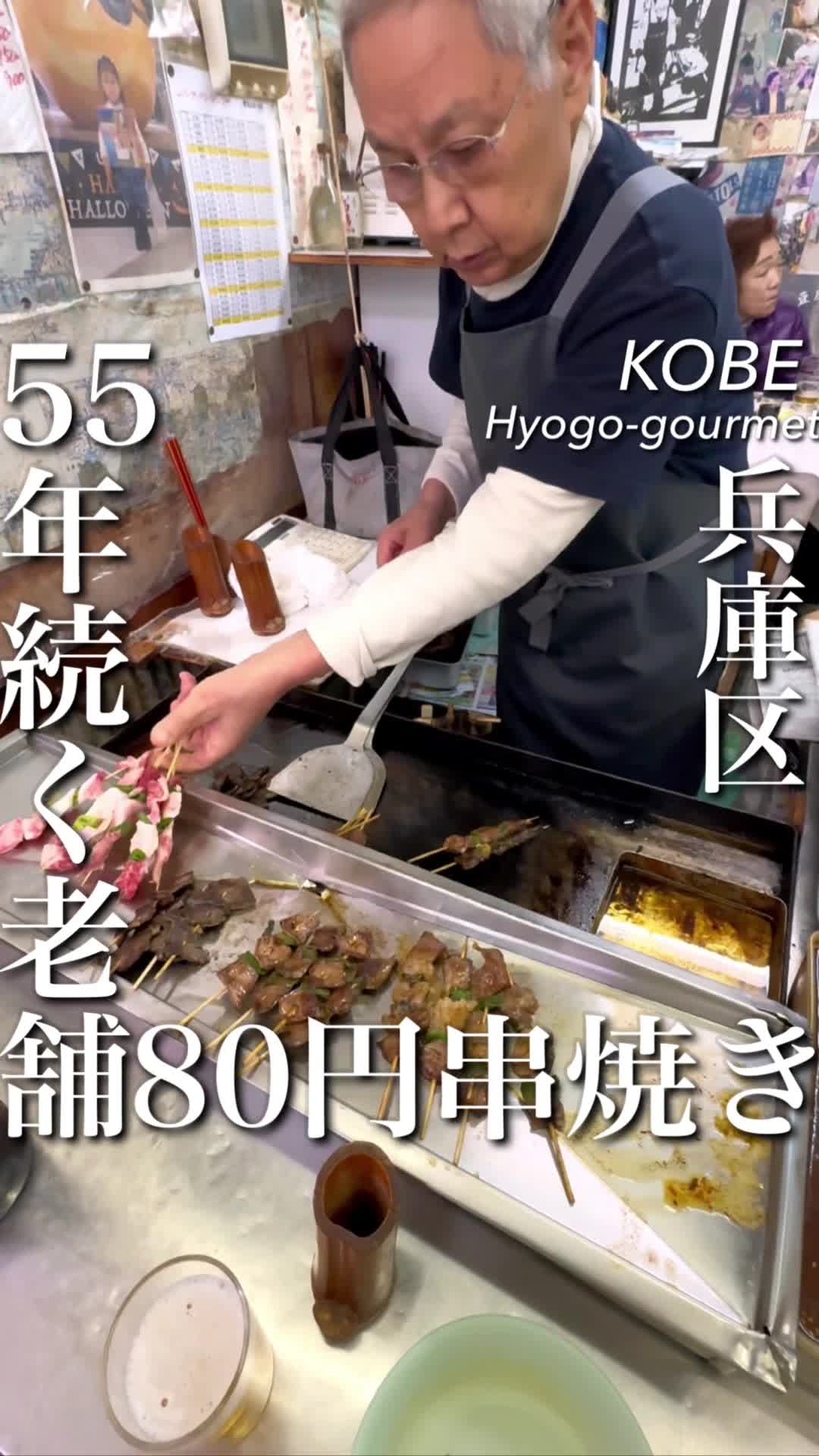 神戸市兵庫区東出町の55年続く老舗ホルモン焼き店です。81歳の店主が自ら焼くホルモンは焼き加減とタレが絶妙です。串焼きは1本80円〜。カウンターのみの立ち飲み風の雰囲気で、10:30〜19:00、定休日は水曜と第三木曜です。