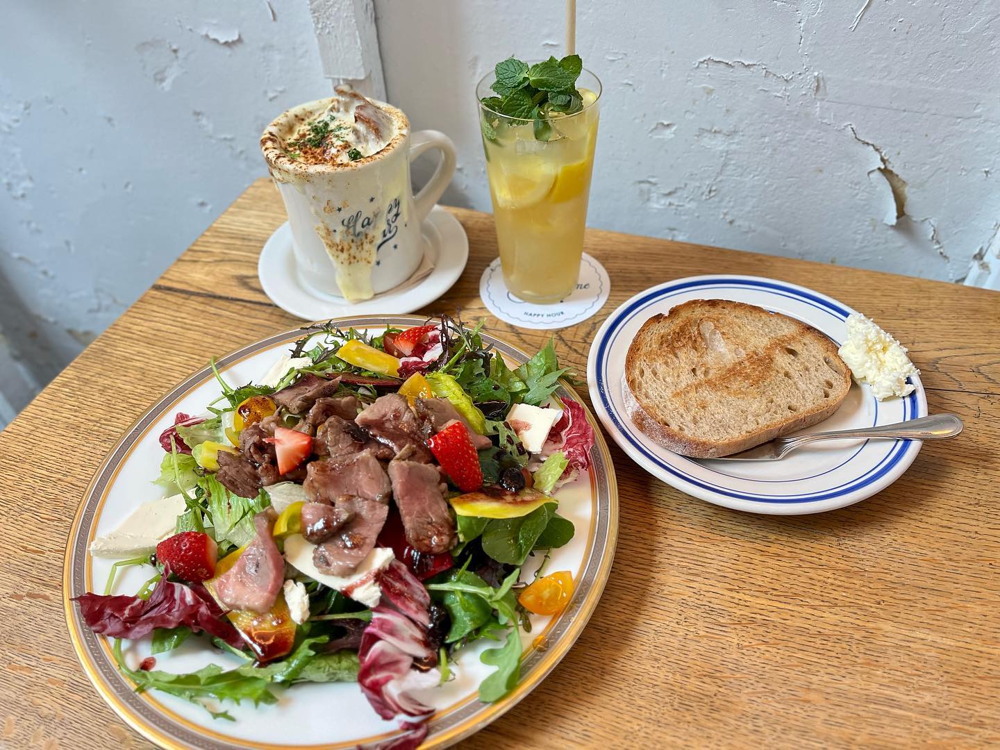 築100年の古民家をリノベーションした恵比寿のカフェです。天井が高く開放的で、オニオングラタンスープは熱々チーズたっぷりです。自家製パン入りでスープと絡めて美味。サラダは10種あり、ローストビーフ&ベリーが人気です。ドッグフレンドリーで写真映えもします。