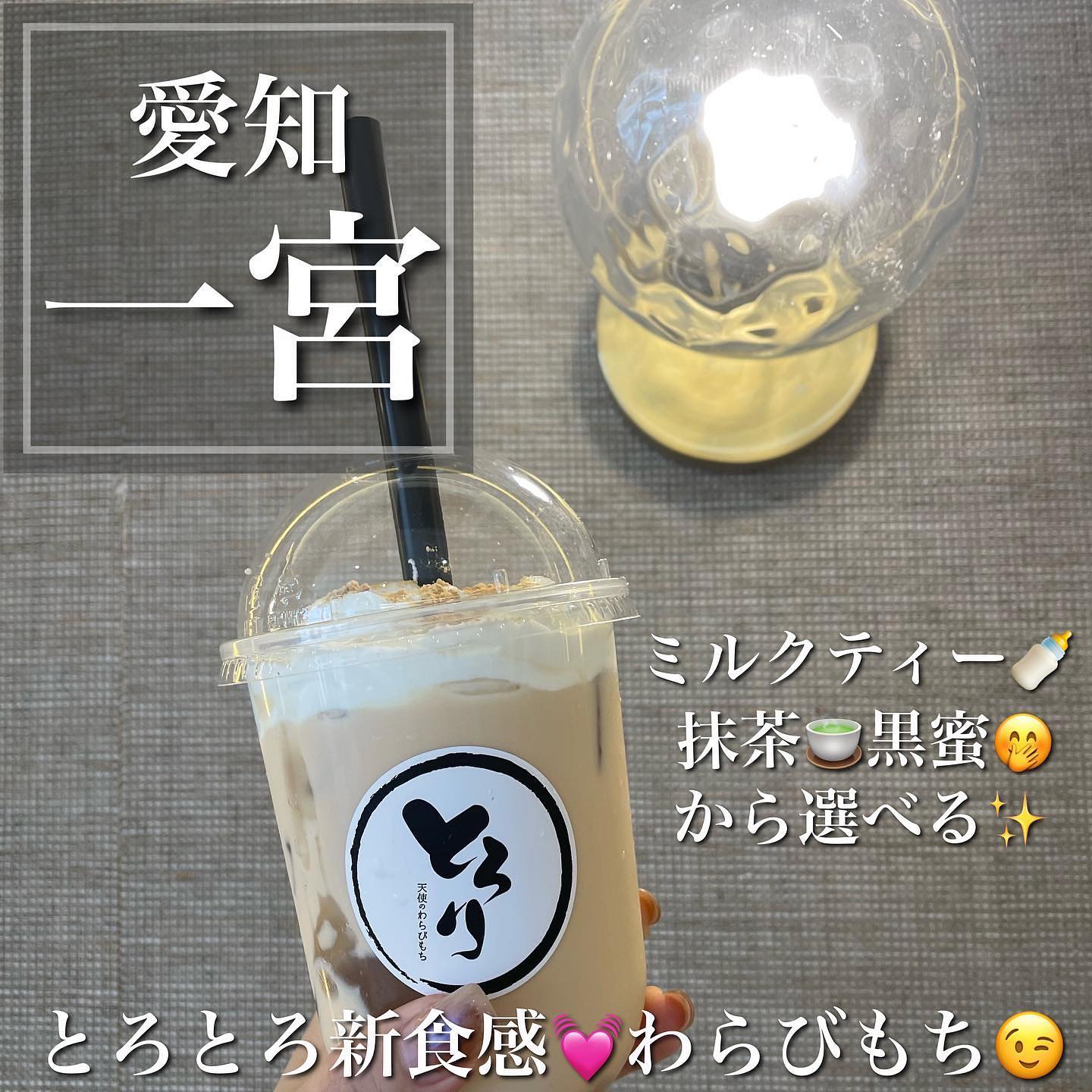 一宮駅近くに新規オープンした『とろり天使のわらびもち』は、飲むわらびもちの新感覚を3種のドリンクで楽しめます。抹茶・ミルクティー・黒蜜がおすすめ。生わらびもち・純生クリームわらびもちなど和菓子系も充実。