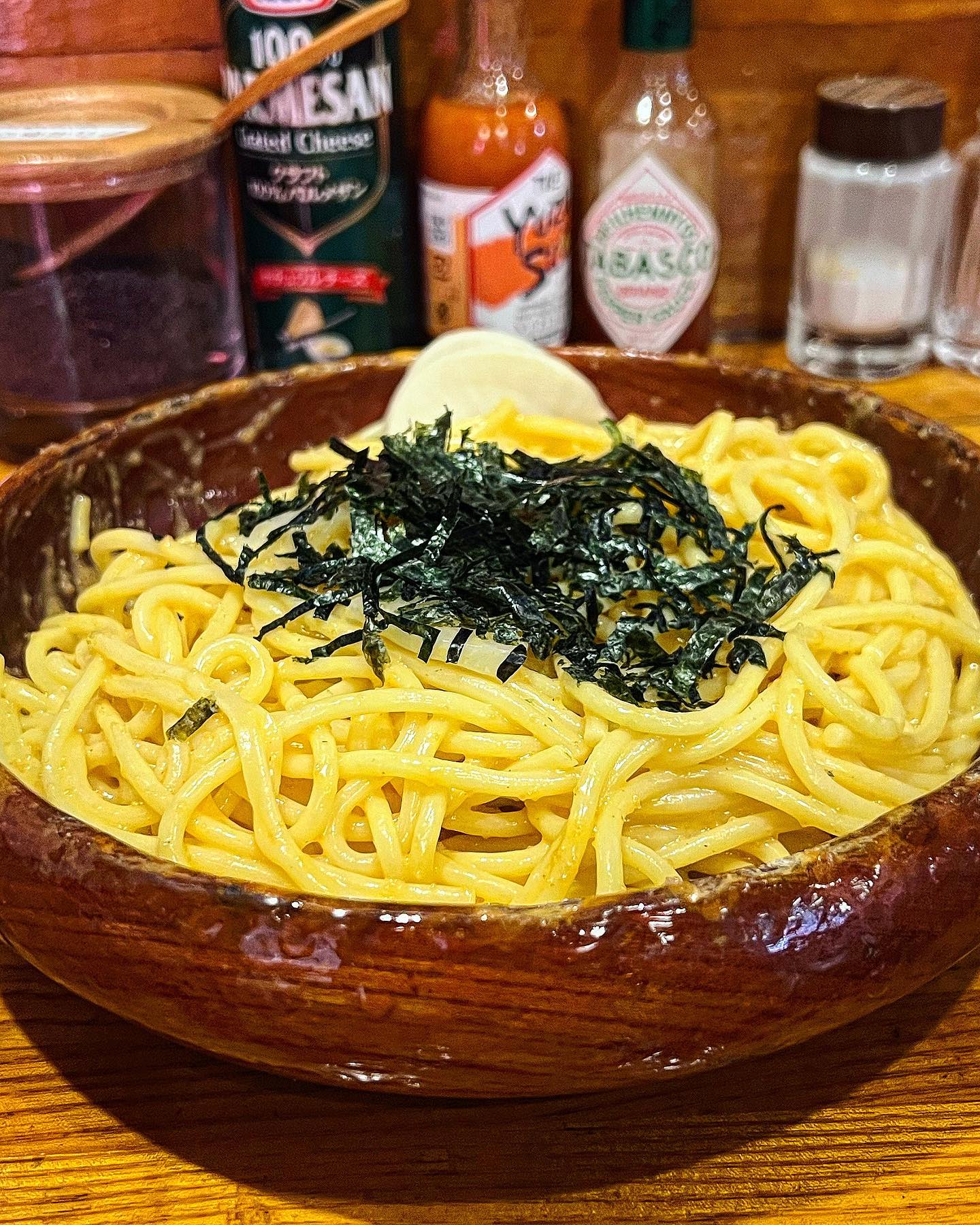 目黒の長年愛される老舗スパゲティ店です。創業45年以上で、49種の中でも特にたらこ系が人気です。たらこ・うに・いか・いくらなどを自由に組み合わせてお召し上がりいただけます。もちもち麺と和風の味わいが特徴です。味変は卓上のゆかりと付属のたくあんでお楽しみいただけます。