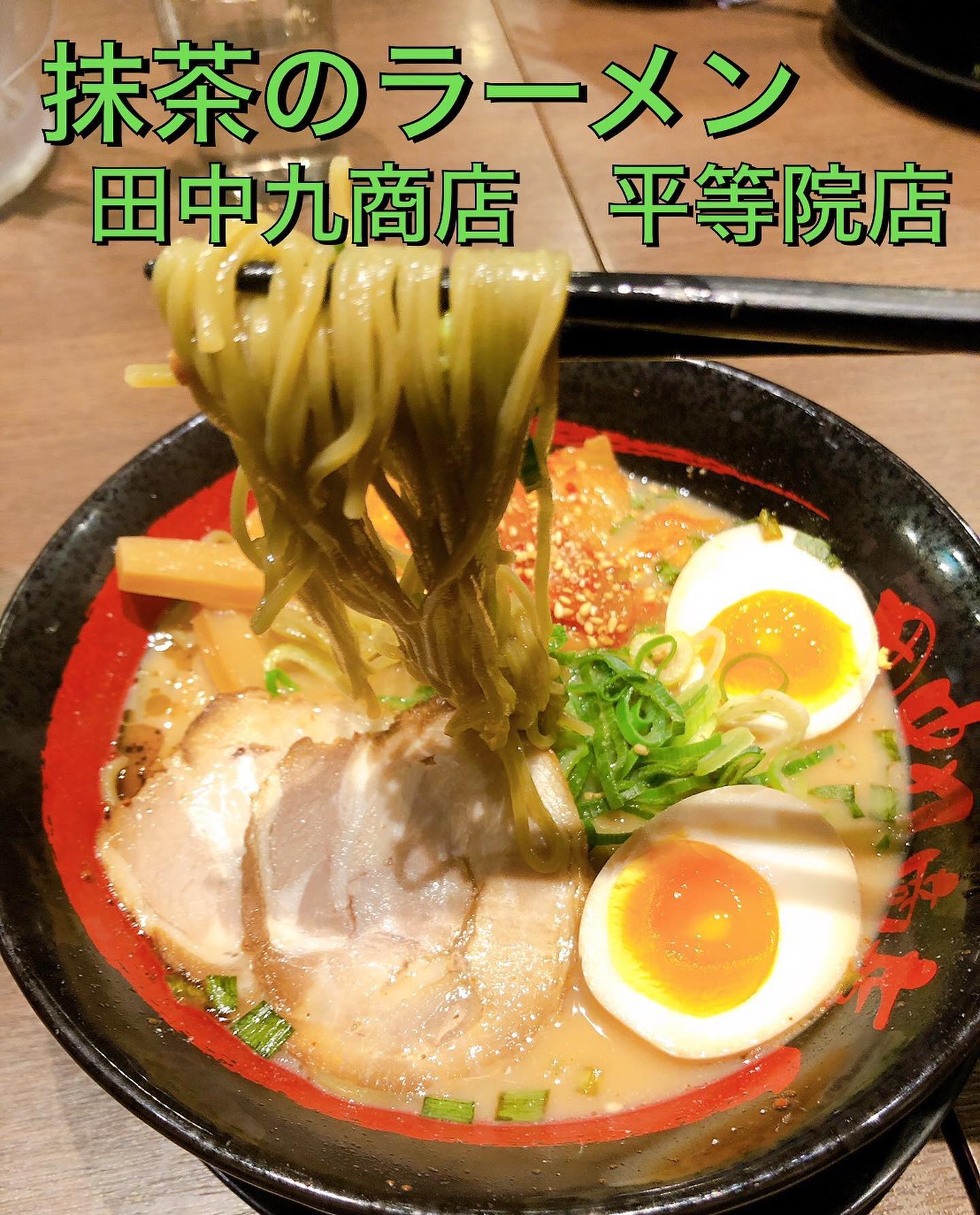 宇治市の平等院近くにある田中九商店は、抹茶を練り込んだ餃子の生地と抹茶塩が特徴のラーメン店です。抹茶ラーメンは麺が抹茶色で見た目も楽しく、餃子は肉汁たっぷりで本格派。抹茶の風味を際立たせる一店です。