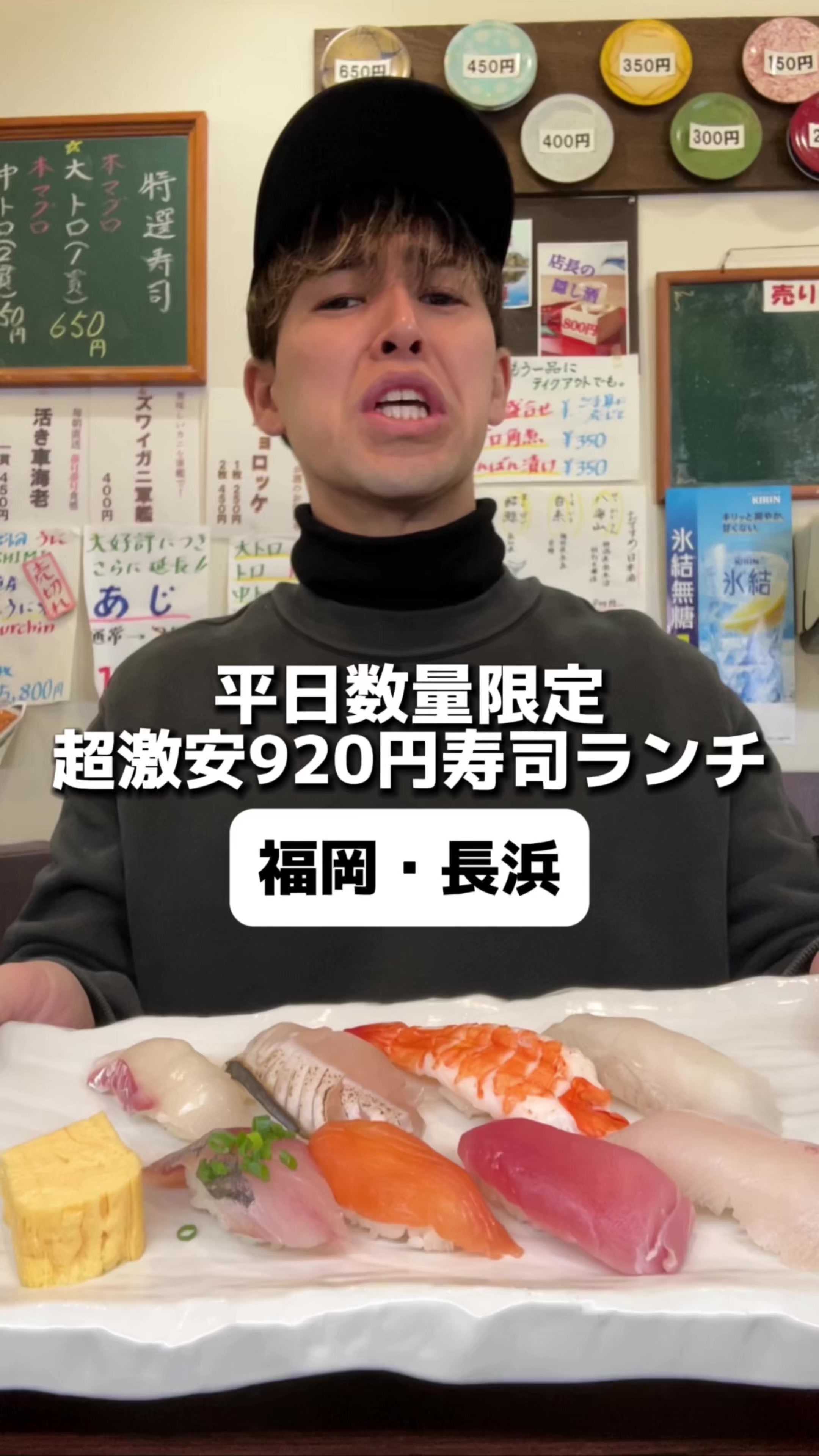 福岡市中央区の回る寿司店。平日限定の寿司ランチ920円は、握り8貫にアジフライと赤だしが付き、コスパ抜群です。新鮮さと職人の丁寧な握りが魅力で、長浜市場すぐそばの立地です。
